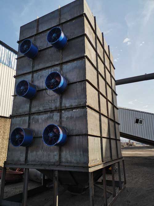 烘干后的熱蘭炭被送入蘭炭冷卻機(jī)種,然后冷風(fēng)開啟對(duì)蘭炭進(jìn)行均勻降溫,由于采用冷氣流的方式,降溫效率高,可在短時(shí)間內(nèi)將蘭炭從一百多度降溫至40度,這個(gè)溫度屬于蘭炭的安全溫度,可以正常的儲(chǔ)存和裝袋,對(duì)生產(chǎn)不造成任何影響。